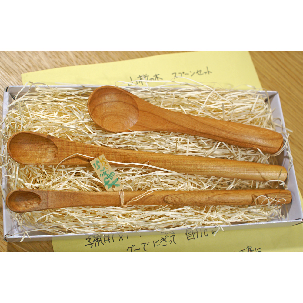 赤ちゃんの離乳食スプーンとして、STEP1とSTEP2、幼児用スプーンの3つをセットにしました。素材はヤマザクラ製、塗料ももちろん安心・安全な天然素材を使用しています。