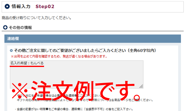 注文画面「連絡欄」にご希望の名入れを、ひらがな五文字以内でご記入ください。