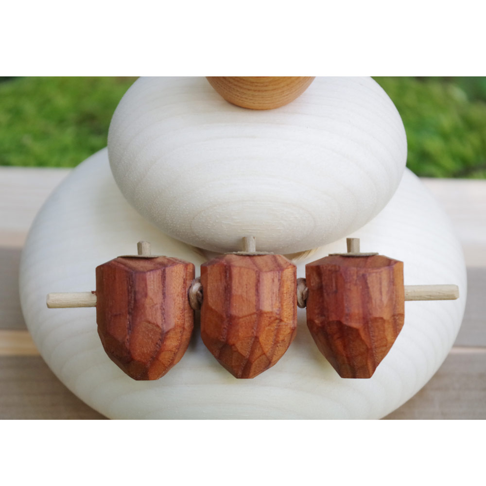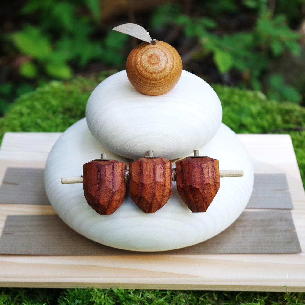 かびない、割れない、組み立て式の木製鏡餅です。鏡餅は、年神様へのお供え物として、また神様の宿る場所として飾られてきました。平安時代から続くとされる、日本の伝統文化です。