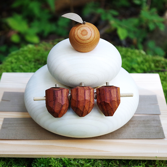 【素材】国産木材(お餅…サワグルミまたはトチノキ、橙…ケヤキ、柿…チャンチン、昆布と葉っぱ…ホウノキ、台座…ヒバ)