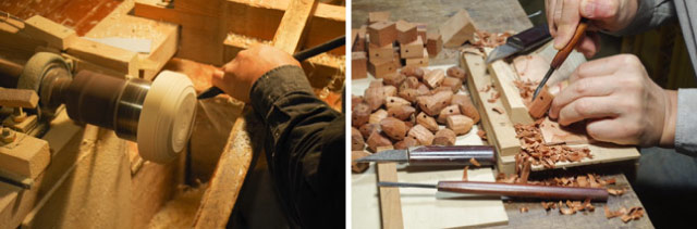 お餅や橙はお椀やお盆を作ったりする「挽物細工」で製作します。柿は一つ一つ小刀で削り、葉っぱや芯も小さなパーツを組み立てて作ります。