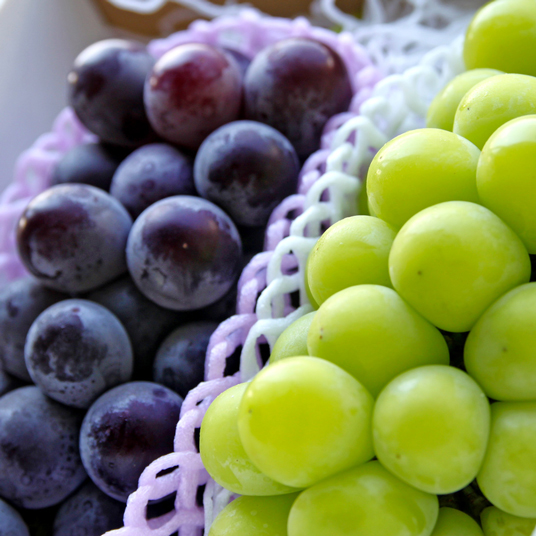 コクが強く食べた時の香りが格別な巨峰と、素晴らしい香りと味のバランスのシャインマスカット。こだわりの果実を、ぜひそのままお召し上がりください。贈り物としてギフト包装もできます。
