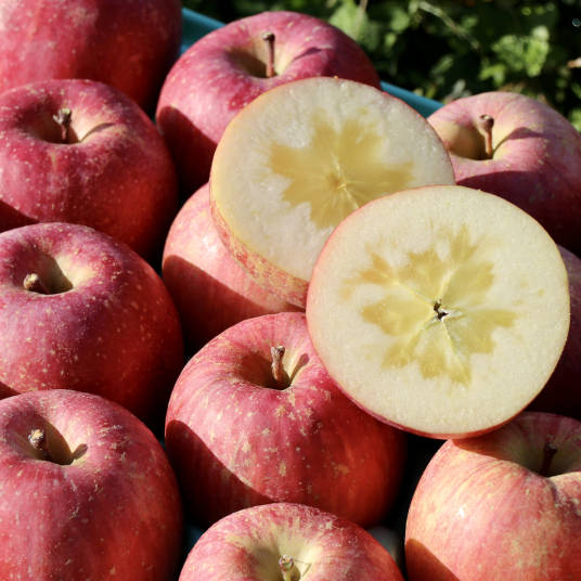 甘み・酸味・歯ごたえの三拍子がそろった、マスニ農園でも一番人気の品種です。蜜入りで、果汁もたっぷり!当園の売りはなんといっても香りです。箱を開けた瞬間に、甘い香りが広がります。リンゴの表面に小傷、台風キズ、サビがあるもの、着色が悪いなど見た目が劣るものがありますが、味は贈答用と変わりなくおいしいリンゴです。25~34玉入り。