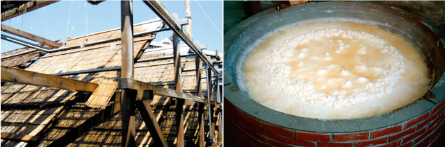 たまったかん水を大釜に運び、煮ます。水分を蒸発させ、さらに濃縮していきます。濾過タンクを通して余分なものを取り除き仕上げ釜で更に20時間煮詰めます。