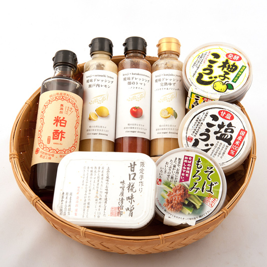 セット内容…無添加「粕酢」、味噌屋清治郎、塩こうじ、そばもろみ、柚子こうじ、糀味ドレッシング「瀬戸内レモン」、糀味ドレッシング「畑のトマト」、糀味ドレッシング「完熟ゆず」