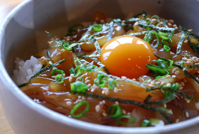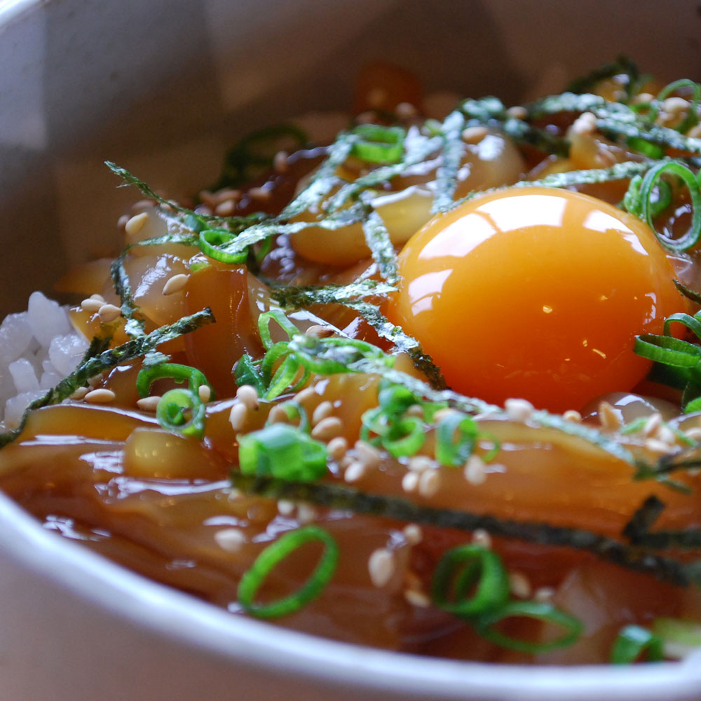 パックのまま流水に3分ほど浸して解凍し、温かいご飯にのせてイカ漬け丼としてお召し上がりいただくのがおすすめです。お好みで卵黄や刻んだネギ、ゴマや刻み海苔などをトッピングしていただくと、より一層美味しくお召上がりいただけます。少量のごま油をかけても美味しさが増します。