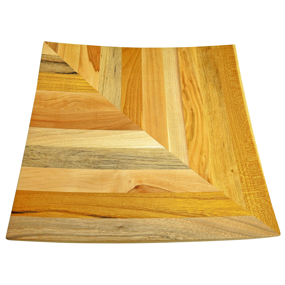 山形県上山市の果樹でつくられた正方形の寄せ木皿です。皿の裏側には使用した果物の木の名前が印字してあります。 彩り豊かな果樹の木の角材をカットし、さらにスクエアに貼り合わせて形作りました。
