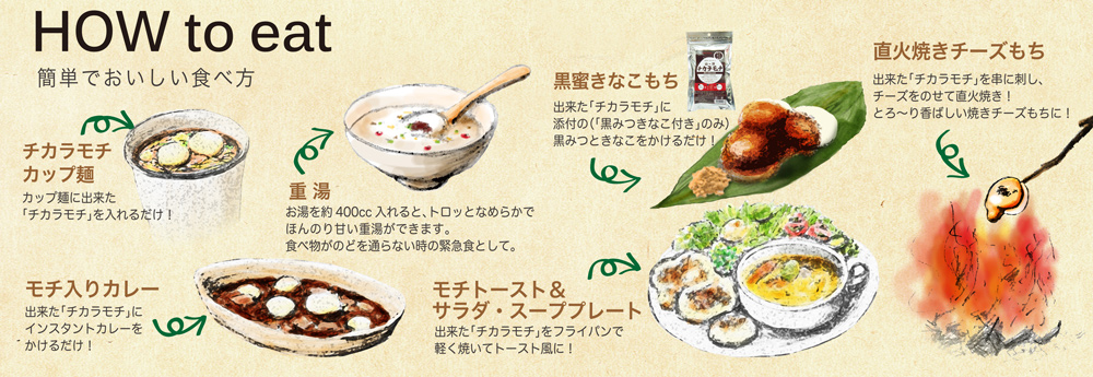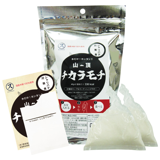 お米を焙煎した独自製法の米粉(アルファ化米粉)を使用し、水を加えて揉むだけで簡単にお餅ができます。腹持ちのいいお餅を登山やキャンプなどの携帯食、シャリバテ対策食としてご利用ください。
