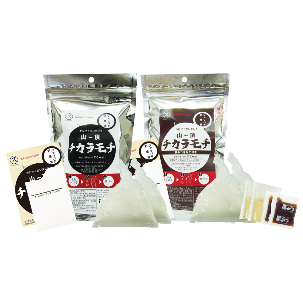 お米を焙煎した独自製法の米粉(アルファ化米粉)を使用し、水を加えて揉むだけで簡単にお餅ができます。腹持ちのいいお餅を登山やキャンプなどの携帯食、シャリバテ対策食としてご利用ください。プレーンタイプと黒みつ・きなこ付きがセットになったお試しセット。