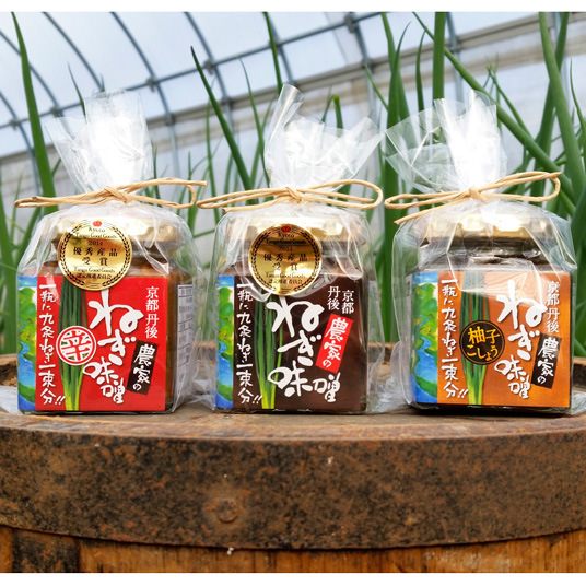 京野菜・九条ねぎと、丹後大豆を使用した「熟成地味噌」を丁寧に炊き上げました。有機肥料でじっくりと育てた自家栽培の九条ねぎを一瓶に一束分使用し、九条ねぎの風味と食感が存分に味わえる、農家自慢のねぎ味噌3種セットです。