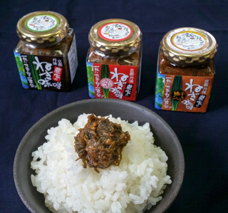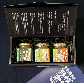 農家の辛ねぎ味噌(中央)…ねぎの風味と、ピリッとした刺激が相性抜群! 与謝野町産辛子のあとひく辛さが癖になります。リピーターの多い一品。