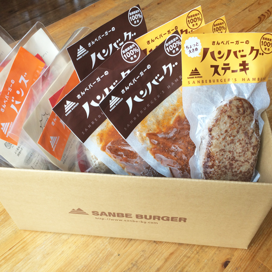 最高のロケーションと食材が織りなすご当地バーガー店SANBE BURGER。自信をもってお届けするハンバーガーが、そのままご家庭で楽しめます。島根県産100%の牛肉、豚肉はおいしい配合を吟味し、塊肉からつくる自信作。パテはあらかじめ焼いてあるので、アウトドアでも簡単に本格バーガーが作れます。