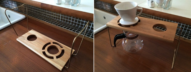 ハンドドリップ用2ポイントスタンド。脚には真鍮を使用し、温かみがあり、随所に日本の職人ならではのきめ細かい技が光る一品です。自然の素材を活かし、1点1点手作りしています。脚の真鍮は、木部に差し込み式なので取り外し可能です。