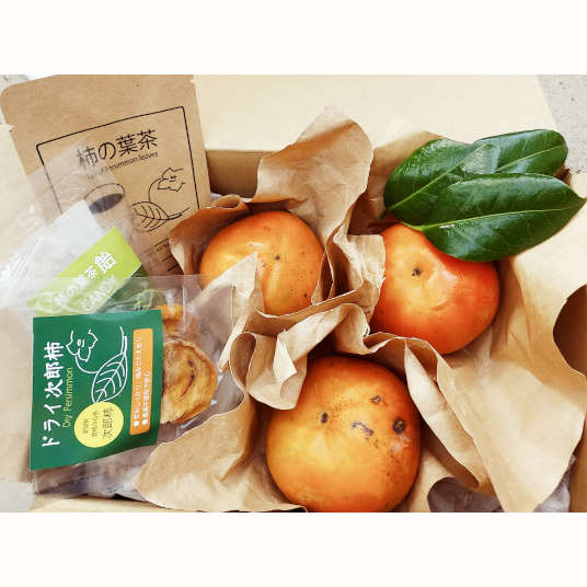 【内容量】次郎柿×3、柿の葉茶葉×1、柿の葉飴×1、ドライ次郎柿×1