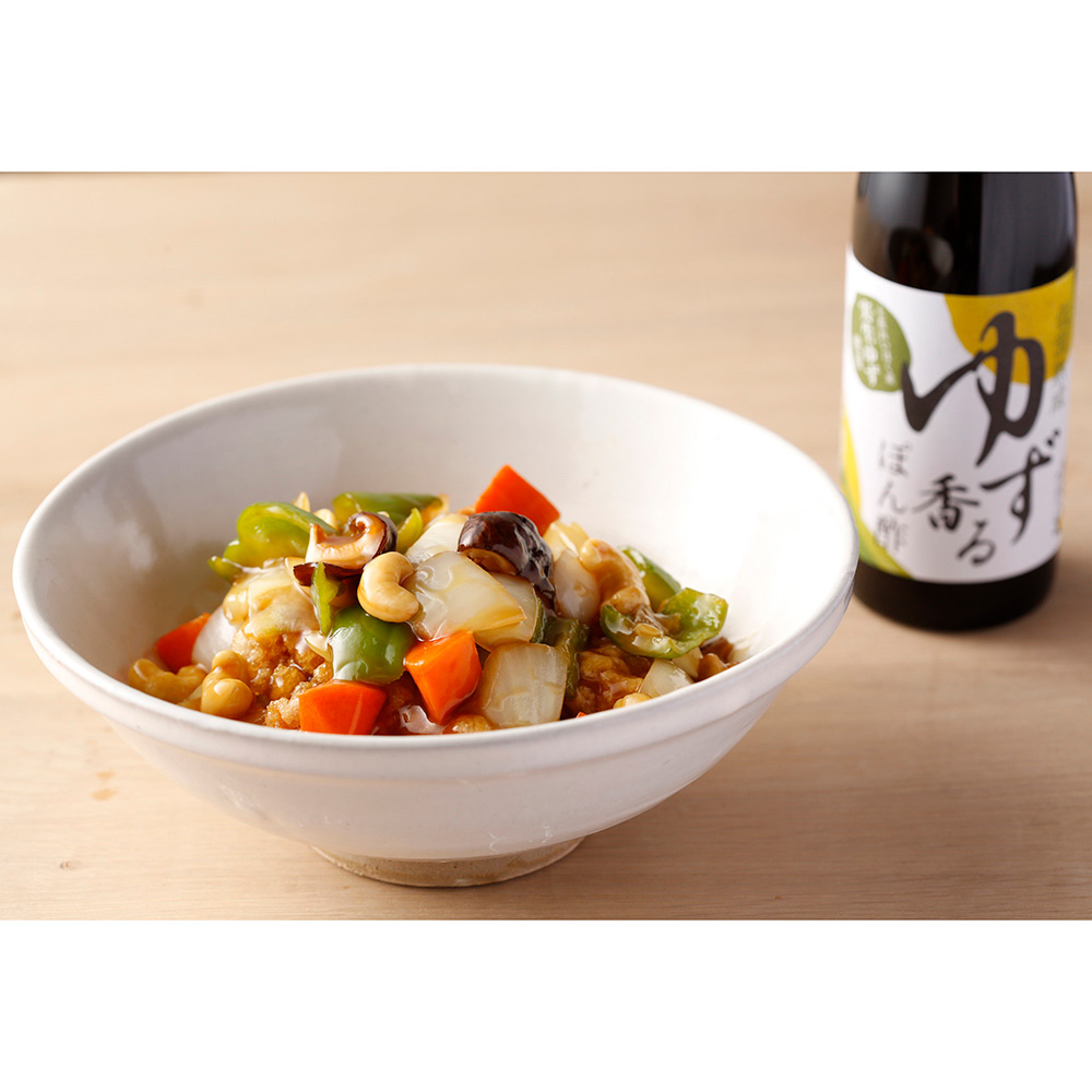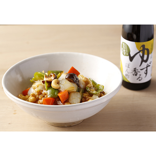 ゆず香るぽん酢…低温熟成させたまろやかな口当たりの本醸造醤油と、実生ゆず果汁をブレンドした、ゆずの香りがさわやかなぽん酢です。