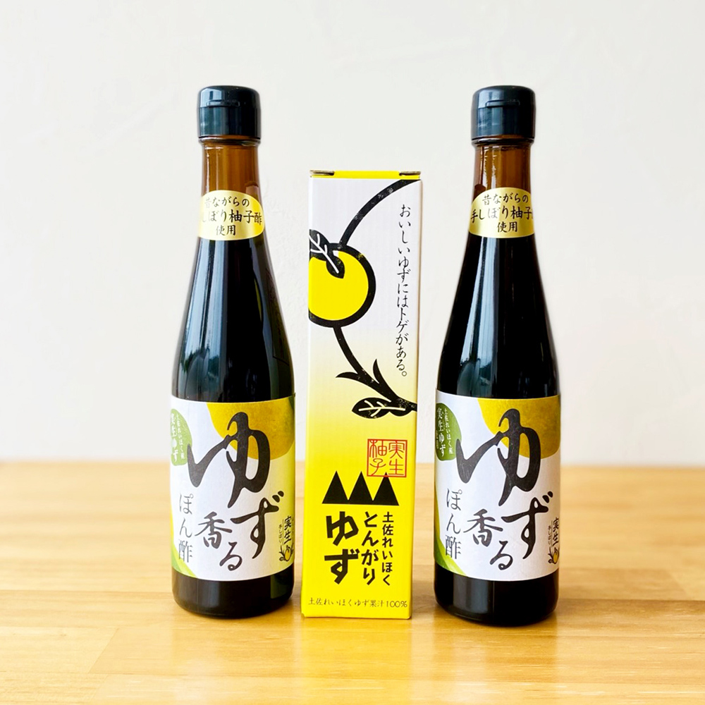 種から育てた「実生」のゆずだけを使ったぽん酢と、とんがりゆず(実生ゆず100%果汁)のセット。収穫したゆずは余計な苦みや不純物が出ないよう、ひとつずつ丁寧に手しぼりしています。