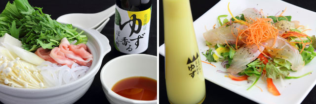 ゆず香るぽん酢:水炊き、ちり鍋、湯豆腐、しゃぶしゃぶなどの鍋物に最適。かつおのタタキや肉料理、焼き魚、サラダ、酢の物などの調味料として、季節を問わずご利用いただけます。