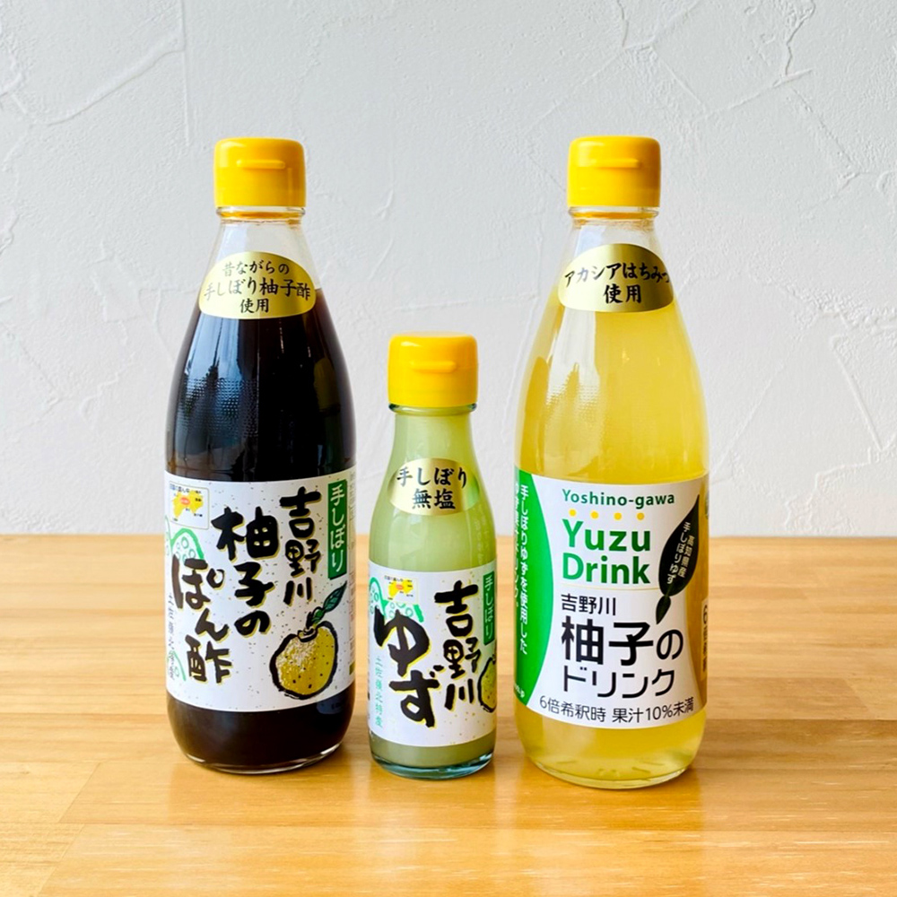 【内容量】吉野川柚子のぽん酢…360ml×1本、吉野川柚子のドリンク…360ml×1本、吉野川ゆず…100ml×1本