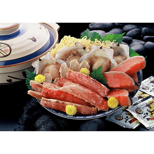 【素材】生タラバ棒肉半殻剥き・生ずわい棒肉半殻剥き・生タラバ肩肉半割 計320g、生ほたて片貝 4枚200g、生サケ切身4切れ240g、ラーメン2玉240g、だし昆布15g×1袋、味噌だれ80g×2袋