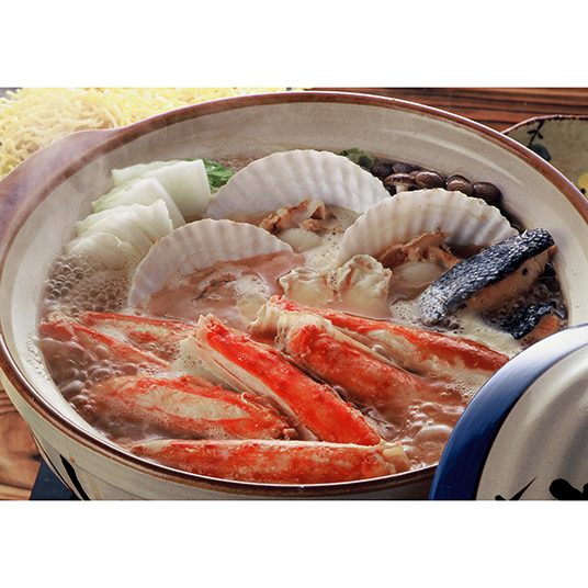 タラバ、ズワイの2種類の新鮮な蟹と魚介類がたっぷり入った本格的な味噌ベースの海鮮かに鍋です。だし昆布、みそだれ、ラーメンの入ったセットです。