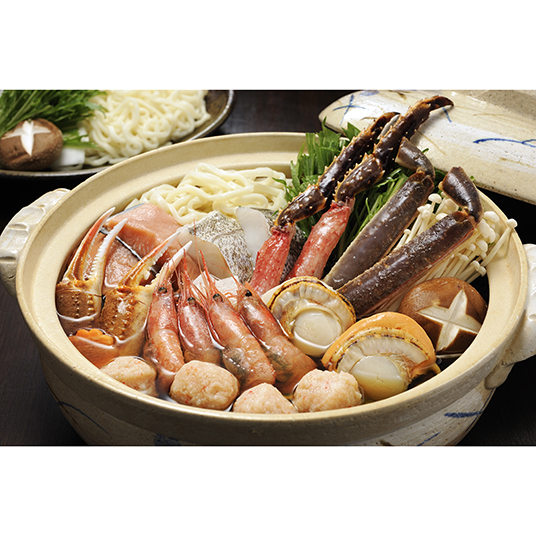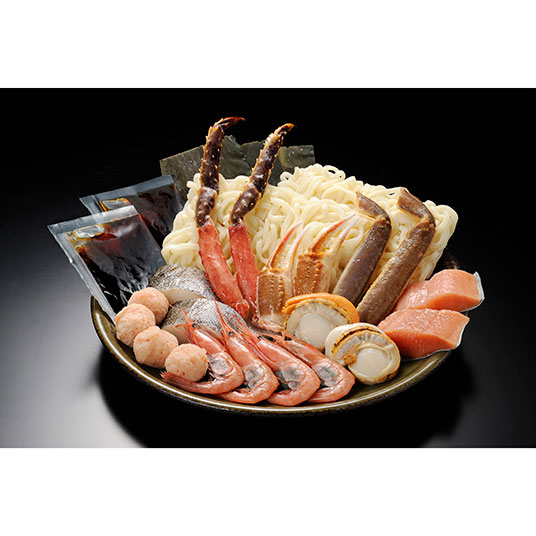 北の海で育ったカニをはじめ、サケ、タラ、ホタテなどさまざまな魚介類の醤油ベースの魚介類の寄せ鍋仕立てです。うどん、だし昆布、醤油だれ付き