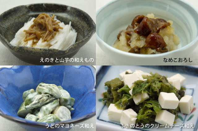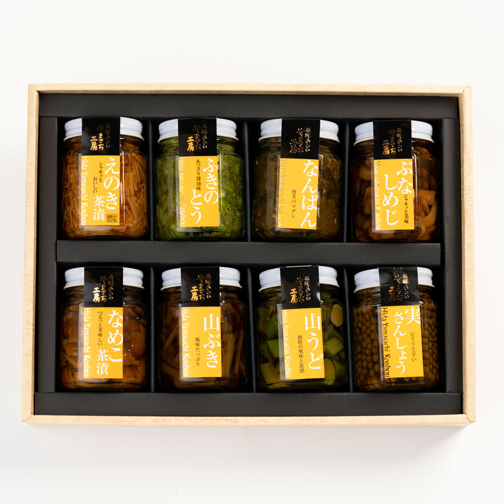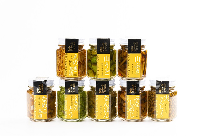 内容は「ふきのとう」「山ぶき」「山うど」「なめこ茶漬」「ぶなしめじ」「実さんしょう」「なんばん(唐辛子)」「えのき茶漬」。昔ながらのふるさとの味を楽しんでいただけるよう、長年変わらぬ素朴な味付けに仕上げています。味付けをしているので、そのままご飯のお供や酒のおつまみにしていただけますが、さまざまな料理にアレンジしてもお使いいただけます。