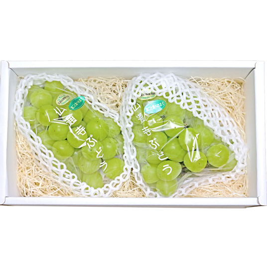 種がなく皮ごと食べられ、まるでデザートのようにいただけるシャインマスカットです。口に入れた瞬間にジューシーで上品な甘みと芳醇な香りが口の中に広がります。とてもデリケートなぶどうで、果実が房から外れやすいため木毛を箱に詰め、優しくぶどうを包み2房入りでお届けします。愛情込めて栽培したこだわりの作物のおいしさをぜひご賞味ください。9月中旬頃より、収穫後発送いたします。