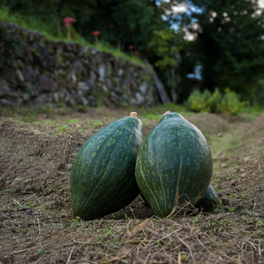 ロロンカボチャは新種の西洋カボチャです。キメが細かく、滑らかな舌触りと上品な甘さから、印象深い味わいをつくりだします。上勝のロロンカボチャは、2億年前に太平洋から隆起した豊富なミネラル分を含んだ土と清涼な天然水で育ちます。