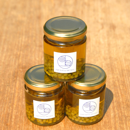 上勝町では、古くから山椒が栽培されて来ました。山のなかで無農薬・無化学肥料で大切に育てられた山椒は、香味と辛味が素晴らしく、さまざまな料理に使われています。この山椒オイルは、そんな実山椒を無添加でエキストラバージンオリーブオイルに漬け込み、香味と辛味を楽しめる食べるオイルに仕上げました。