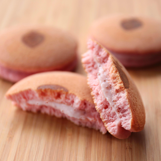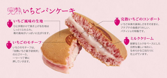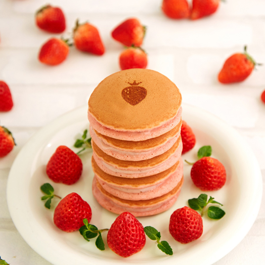 自社農場で育てた完熟いちごの特製コンポートがたっぷり入ったいちごミルククリームを、いちご風味のパンケーキでサンドしました。いちごの風味が口いっぱいに広がる、極上のスイーツです。なめらかないちごミルククリームと、ふわふわに焼き上げたパンケーキの最高のコンビネーションをお楽しみください。