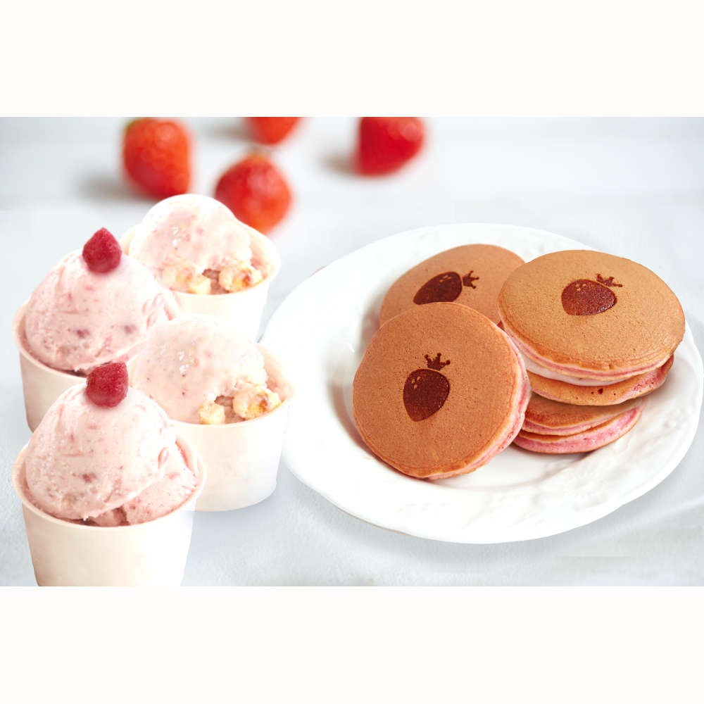 【内容量】パンケーキ3個、ジェラート(プレミアム・ストロベリー2個、ストロベリー・チーズケーキ2個)