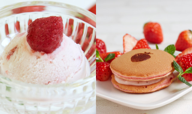 「完熟いちごパンケーキ」は生地にメレンゲを加えるというひとてまを掛け、熱が均一に伝わるこだわりの銅板でむらなくしっとりふんわり焼き上げています。「完熟いちごジェラート」は地元企業様とのコラボ商品。いちごを作っているからこそ出来る贅沢ないちご使いで、他にはないいちごの果実味を存分に味わっていただけるジェラートを作りました。
