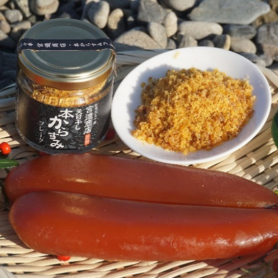 伝統的な天日干しの本からすみをフレークにしました。門外不出・家伝の製法による絶妙な塩加減で旨みを最大限に引き出しています。本からすみのもっちりとした特徴を生かした優しい食感の仕上がりです。丁寧に仕上げた黄金色に輝くからすみフレークは、料理に彩を添え、コクや旨みを加えてくれます。パスタやリゾットへのトッピングなど、和食以外でもご利用いただけます。調理過程で「旨塩の代わり」としてさまざまな料理にお使いください。
