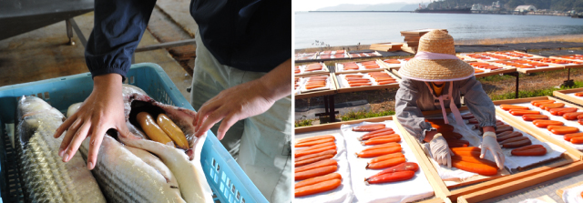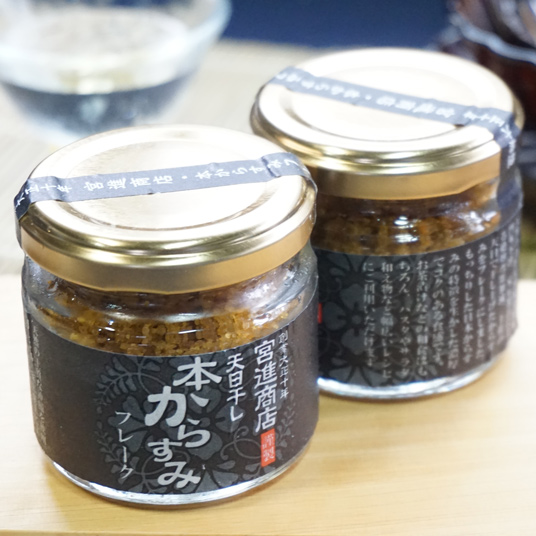 製法は製造元によって違いますが、宮進商店では、血抜き、塩漬け、塩出し、油抜き、押し、天日干しという工程で作ります。なかでも味を決める重要な工程は塩出しです。一腹一腹、塩の入り加減を調整するのは長く培われた手指の感触なくしてはできません。塩出しにより塩梅を調整された真子は「天日干し」と「押し」を繰り返すことにより、香ばしい飴色のからすみに仕上がります。加えるものは「塩」のみです。塩の力と天日により、上質な発酵が促され、からすみ自体が旨味を生んでくれます。まさに素材の旨味を生かすことを考えた製法です。