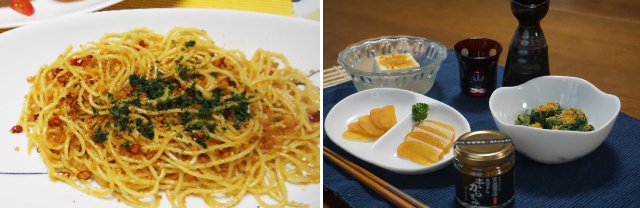 パスタにからすみをふりかけて食べるイタリアのサルデーニャ島名物スパゲティ・アラ・ボッタルガはもちろん、リゾットに混ぜたり、クリームチーズを塗ったバケットにふりかけかけたり、さまざまなアレンジができます。白ワインによく合います。