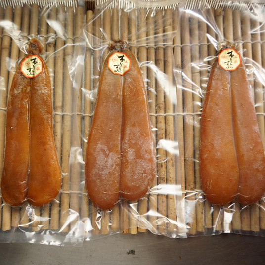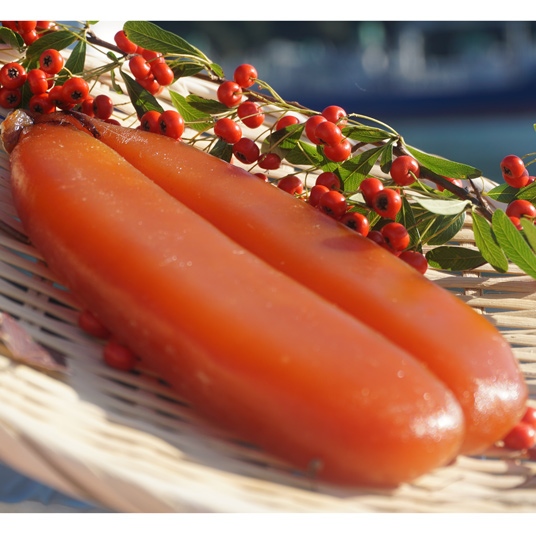 珍味・高級品の代表的な本からすみは、形が中国の墨に似ていることから、唐墨(カラスミ)と呼ばれる様になりました。本からすみは出世魚であるボラの真子を手間と時間をかけて精製したもので、旬のものを「名吉(なよし)」とよび、名を広める意味があるとされ御祝儀の場などで珍重されています。