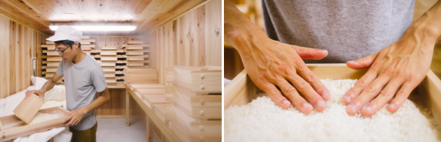 こうじは伝統的な製法である麹蓋(こうじぶた)を使って作っています。麹蓋にお米を小分けにして盛り、麹室(こうじむろ)という高温多湿な専門の部屋の中で、温度や湿度に合わせて移動や積み替えを繰り返して、1枚1枚丁寧に均一にこうじ菌を育てます。