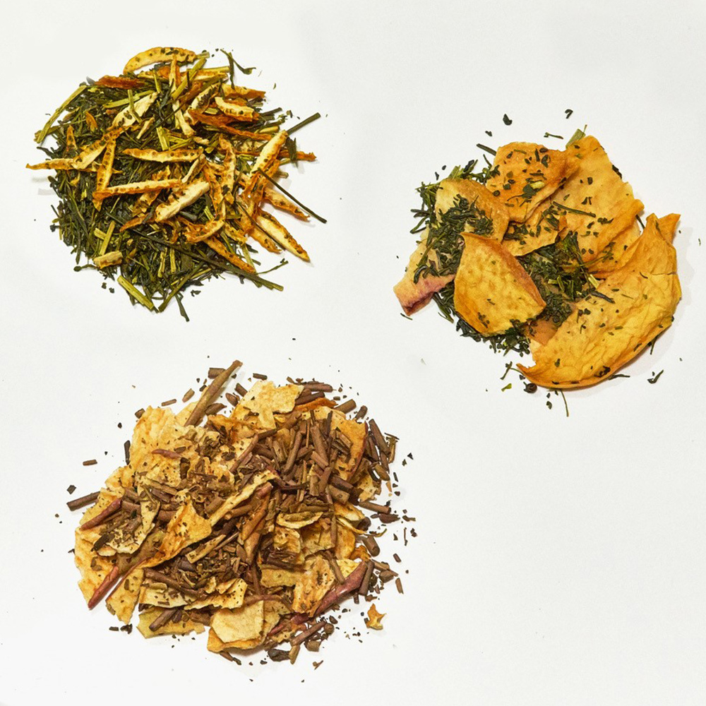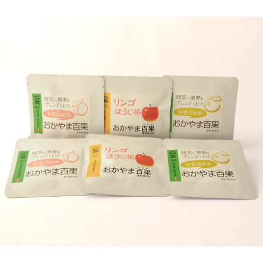 「くだもの王国」岡山の魅力を感じてもらいたいと作ったブレンドティーです。岡山産の果実「モモ・リンゴ・ユズ」をドライ乾燥させ、渋みが少なくさっぱりとした茎茶・茎ほうじ茶とブレンドしました。