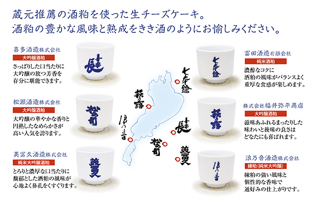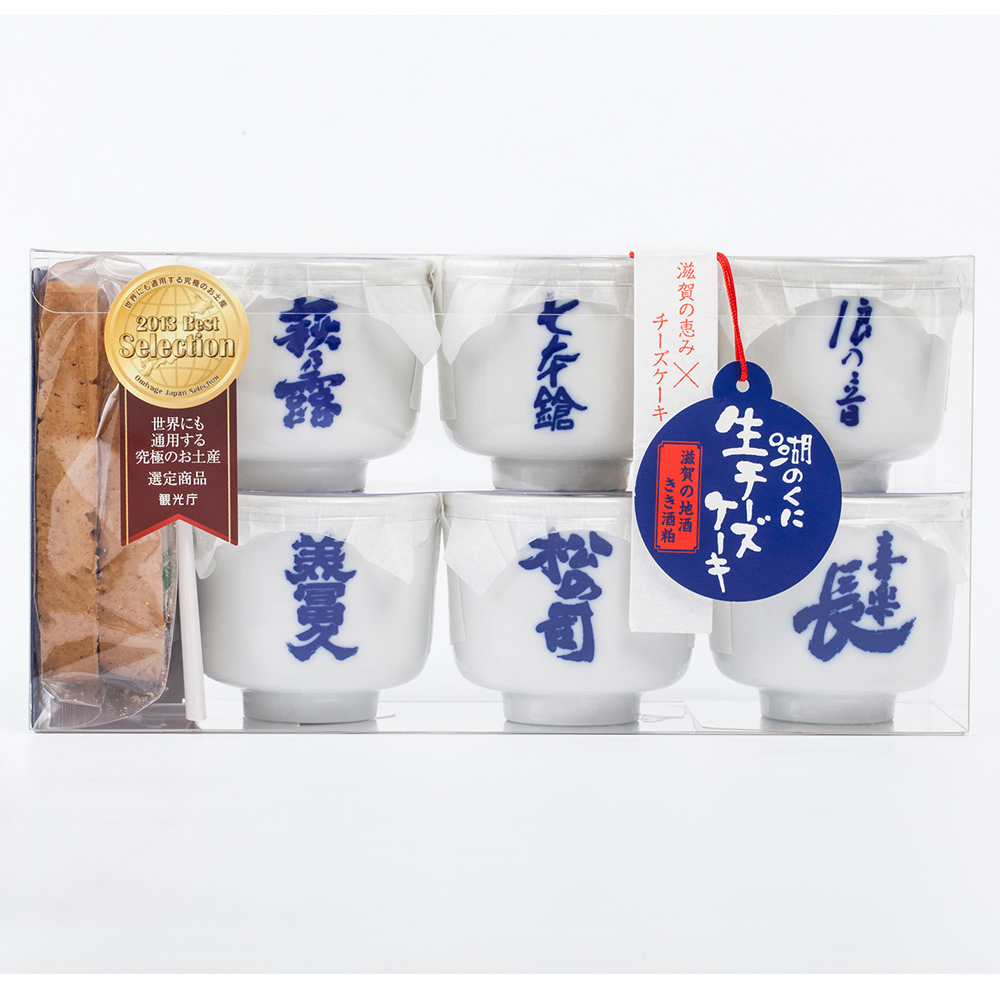個性豊かな滋賀の6酒蔵の酒粕と清酒を使った贅沢なレアチーズケーキです。6酒蔵の酒粕の、熟成によって変わる香りと味の変化をお楽しみください。