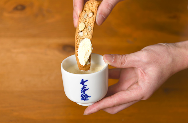 セットの酒粕ビスコッティでチーズケーキをすくって食べるのもおすすめです。酒粕とアーモンドを練り込んだ生地は表面はサクッと、中はしっとり。チーズケーキの華やかな酒粕の香りとビスコッティの香ばしい味わいは相性抜群です。