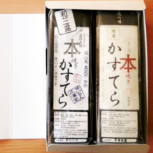 岡山県真庭市にある三代続くかすてら専門店が、地元材料、季節の材料にこだわってつくりあげた、2種の味のかすてらのセットです。キメの細かい上品な口当たりで、深みのあるすっきりとした甘さに仕上げました。