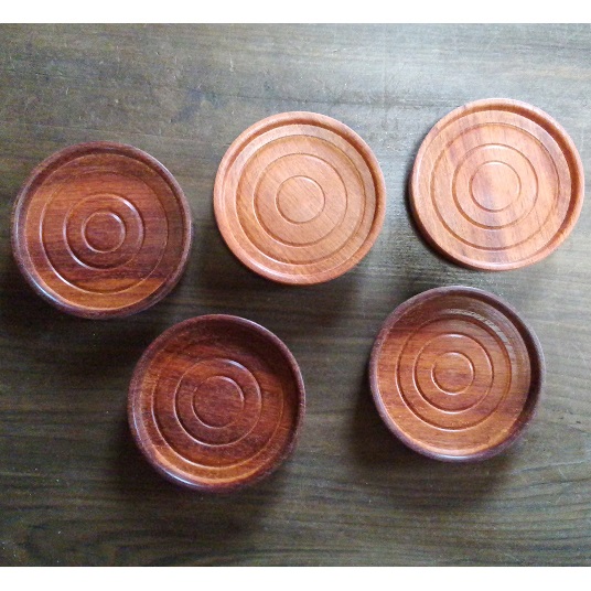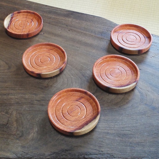 地元の欅、桑、栃などの天然木を使い、木地挽きという伝統技法で作ったコースター5枚セットです。