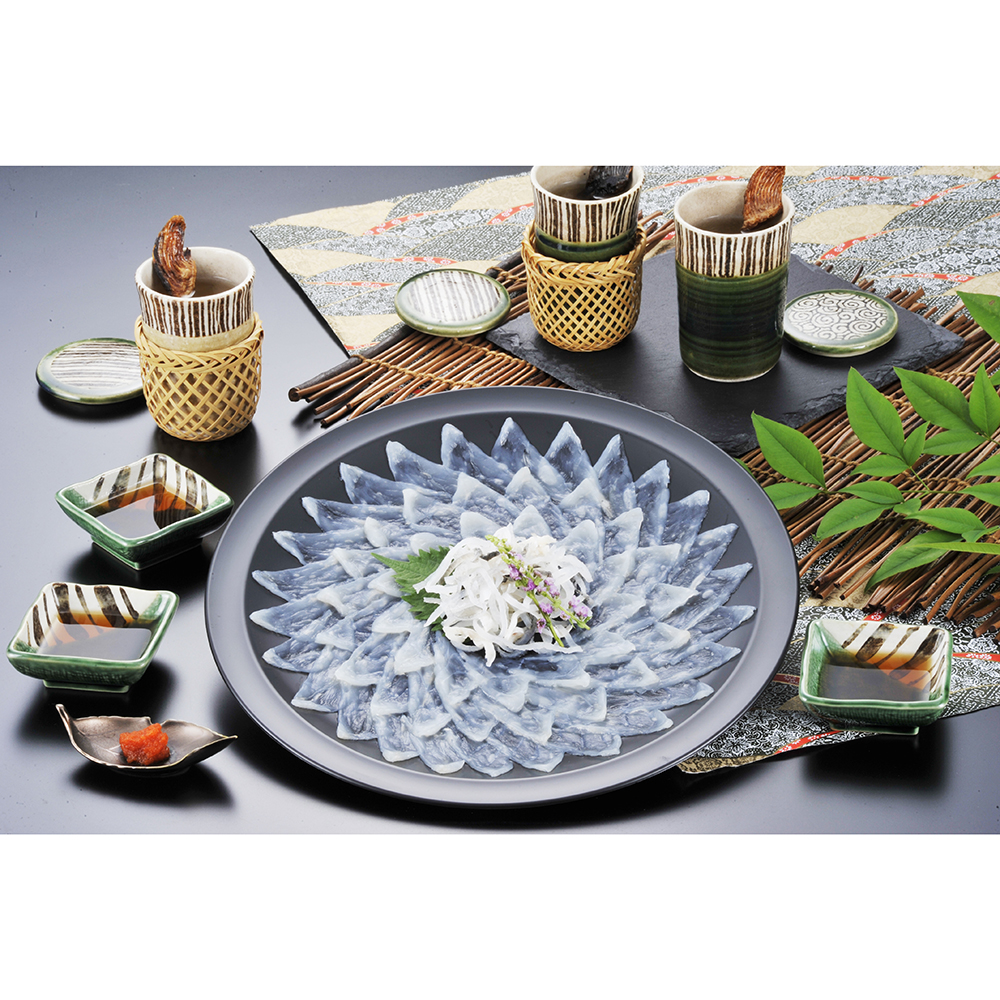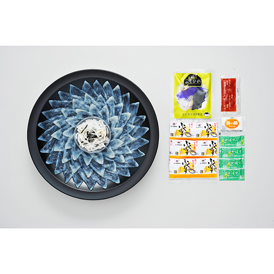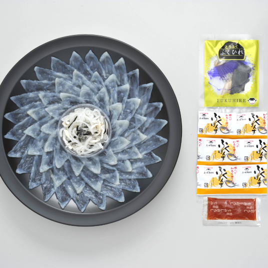 【内容量】とらふく刺身90g(プラスチック皿30cm)、とらふく皮30g、ひれ酒用ヒレ3枚、ポン酢35g×3、もみじおろし16g