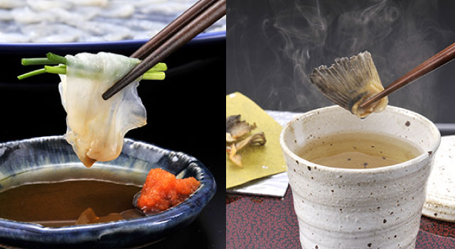 【ひれ酒】焼き網にのせ弱火でじっくり焼いた後、日本酒を薄く塗りあぶります(3~4回)。湯のみなどに熱燗にした日本酒とあぶったヒレ1枚を入れ、ふたまたはラップをして約3分待ちます。澄んだ琥珀色になったところで出来上がりです。