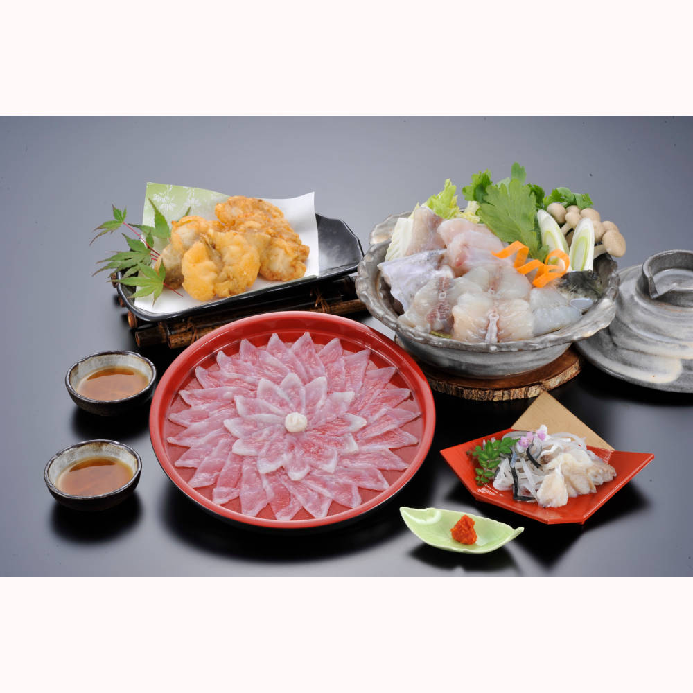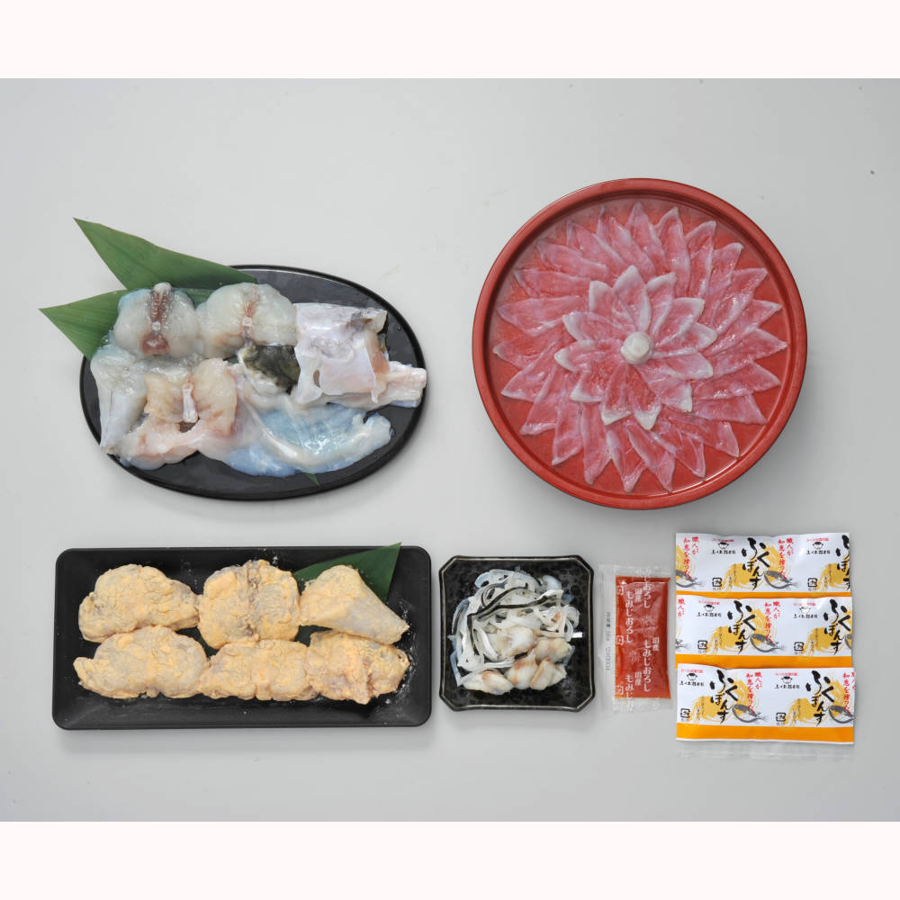 【内容量】とらふく刺身50g(プラスチック皿21cm)、とらふく皮40g、ふくちり240g(アラ:トラフグ・身:マフグ各120g)、ごまふく から揚げ粉付き200g、ポン酢35g×3、もみじおろし16g