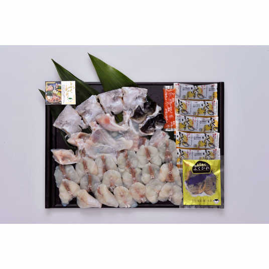 【内容量】ふくちり900g(アラ:トラフグ、身:マフグ各450g)、ひれ酒用ヒレ5枚、ポン酢35g×5、もみじおろし16g
