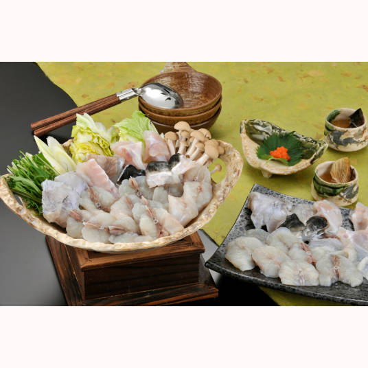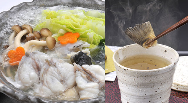 【ふくちり】鍋に昆布と水を入れ30分以上おきます。火にかけ、沸騰する前に昆布を取り出し、かくし味に塩を一つまみ。フグのあらを入れ、あく(泡)を取り、フグの身、野菜を順次入れポン酢、もみじおろしをつけお召し上がりください。残ったダシで作る雑炊も格別です。