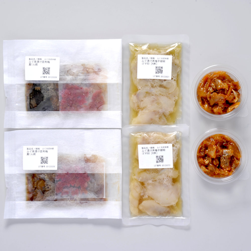 ③ふく生茶漬けこんぶうめ…[ふぐ]標準和名マフグ(山口県)、醤油(大豆・小麦を含む)、みりん、酒、昆布、食塩/トレハロース、[調味梅漬]梅、食塩/酸味料(クエン酸、酢酸)、着色料(ムラサキイモ色素)