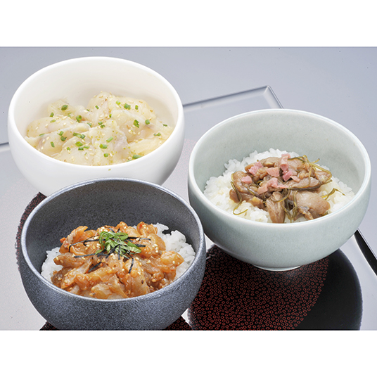 とらふくの食感と辛味と風味が食欲をそそるユッケ風丼ぶり、辛みと柚子のさわやかな風味が絶妙なごまふくだし漬け丼ぶり、まふく身を昆布、醤油ベースで味付したダシに刻み梅をのせた生茶漬けです。