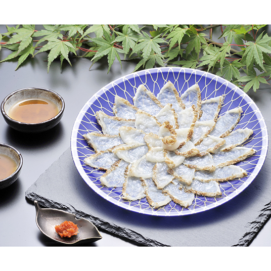【素材】【ふぐ炙り刺身】標準和名マフグ(山口県)、食塩/トレハロース、【ポン酢】醤油(大豆・小麦を含む、国内製造)、橙果汁、醸造酢、みりん、だし(かつお節、そうだかつお節、むろあじ節)、昆布エキス、食塩、【モミジオロシ】大根(国産)、赤ピーマン、醸造酢、唐辛子/増粘剤(マンナン)